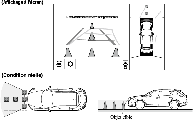 La portée de détection du capteur de stationnement est limitée. Par exemple, les obstructions se rapprochant sur le côté et les objets de faible hauteur peuvent ne pas être détectés. Toujours vérifier visuellement la sécurité du véhicule lors de la conduite.