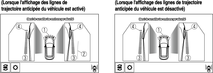 Il est possible de modifier le réglage de manière à masquer les lignes de trajectoire anticipée du véhicule.
