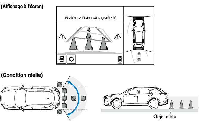 La portée de détection du capteur de stationnement est limitée. Par exemple, les obstructions se rapprochant sur le côté et les objets de faible hauteur peuvent ne pas être détectés. Toujours vérifier visuellement la sécurité du véhicule lors de la conduite.