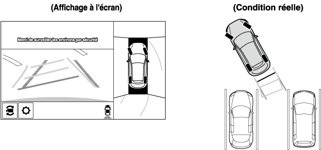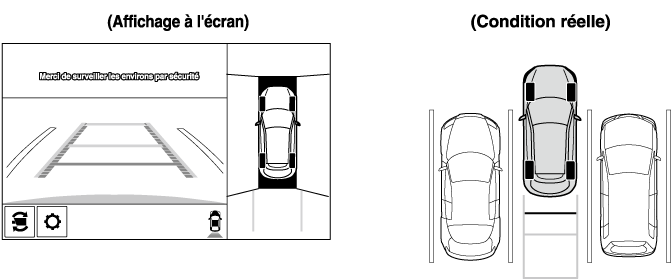Comme il peut y avoir une différence entre l'image affichée à l’écran, comme indiqué ci-dessous, et les conditions réelles du stationnement, toujours vérifier la sécurité à l'arrière du véhicule et dans la zone environnante directement avec les yeux.