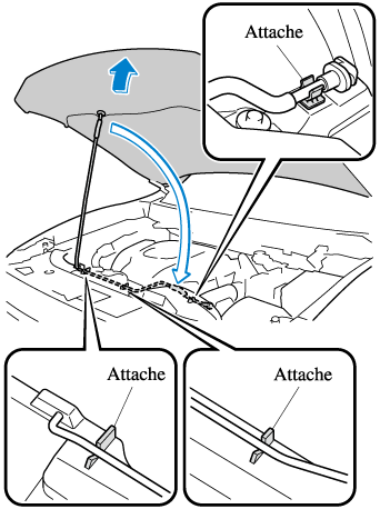2. Soulever le capot, saisir l'endroit du caoutchouc sur la tige de support et le fixer la tige de support dans l'attache. Vérifier que la tige de support est fixée dans l'attache avant de fermer le capot.