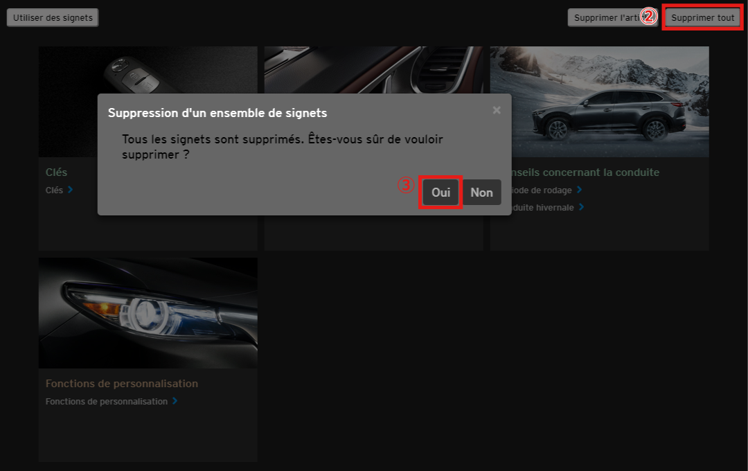 Tous les éléments enregistrés sont supprimés lorsque vous sélectionnez "Oui".