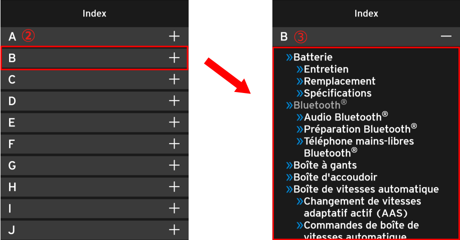 Les éléments répondant aux mots-clés saisis dans le champ ② s'affichent. En sélectionnant l'élément que vous souhaitez examiner, des explications sur son utilisation et ses fonctions s'affichent.