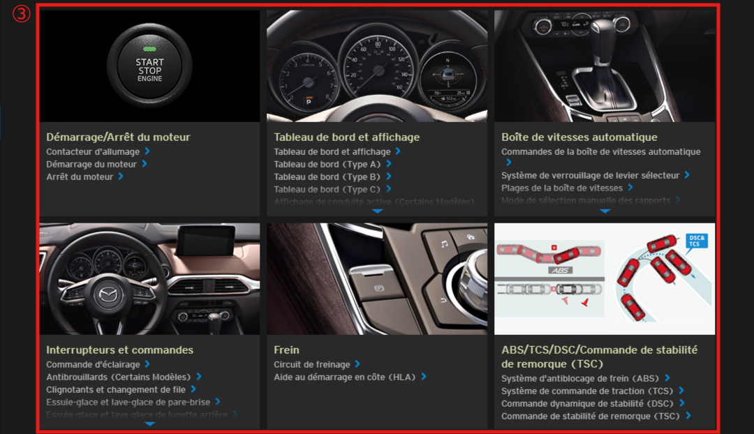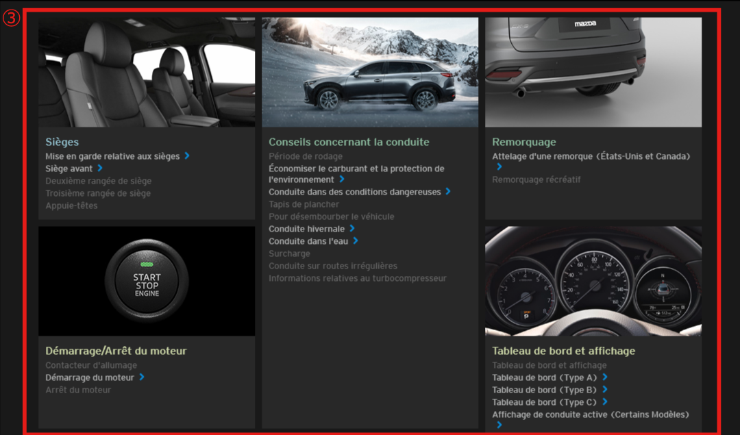 Les illustrations complètent le texte afin de vous expliquer comment profiter au mieux de votre Mazda. Toutes les caractéristiques, informations concernant la sécurité et conduites sous différentes conditions sont expliquées dans ce manuel Conduite et Entretien en ligne.