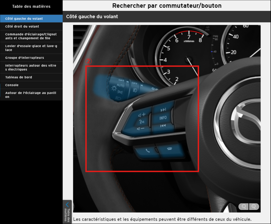 En sélectionnant un commutateur/bouton, des informations sur son utilisation et ses fonctions s'affichent.