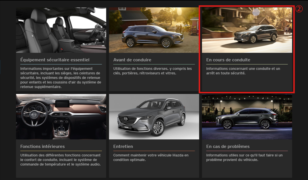 Afin de profiter pleinement et en toute sécurité de votre véhicule Mazda, lisez attentivement ce manuel Conduite et Entretien en ligne et suivez toutes les recommandations.