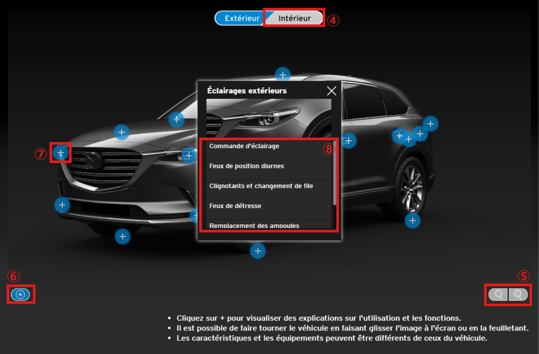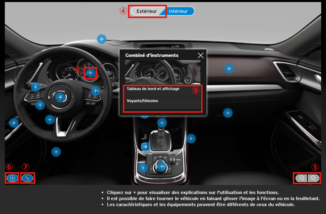 De plus, si vous utilisez un téléphone mobile ou un autre dispositif informatique équipé d'une fonction gyroscopique, vous pouvez modifier les angles à l'intérieur du véhicule en déplaçant l'appareil (images intérieures du véhicule uniquement).