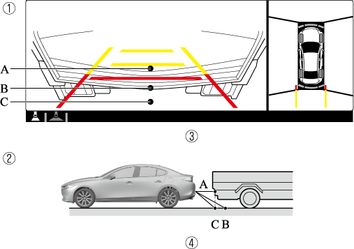 Étant donné que les lignes de guidage d’extrémité avant du véhicule ou les lignes de guidage de distance (caméra arrière) sont affichées sur la base d'une surface plane, la distance à l'objet en trois dimensions affichée sur l'écran est différente de la distance réelle.