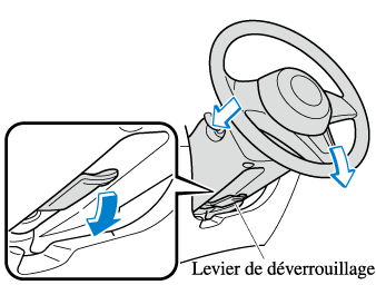 Abaisser le levier, déplacer le volant à la position la plus basse, puis le pousser vers le bas et le reculer complètement.