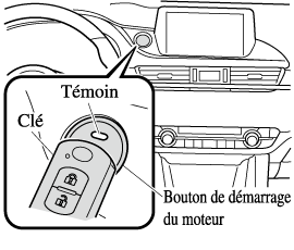 En cas d'anomalie avec la fonction du bouton de démarrage du moteur, le témoin du bouton de démarrage du moteur (ambre) clignote. Dans ce cas, il est possible que le moteur démarre, mais le faire inspecter dès que possible par un concessionnaire agréé Mazda.