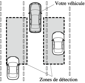 La zone de détection sur ce système couvre les voies de circulation des deux côtés du véhicule et depuis la partie arrière des portières avant à environ 50 m (164 pieds) derrière le véhicule.