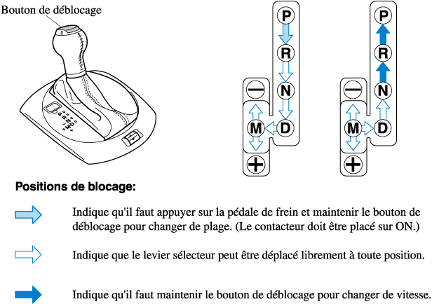 La Sport AT possède une option que ne possède pas la boîte de vitesses automatique traditionnelle, qui permet au conducteur de choisir lui-même chaque rapport au lieu de laisser entièrement le choix du changement de vitesses à la boîte de vitesses. Même si l'on a l'intention d'utiliser les fonctions de boîte de vitesses automatique comme boîte automatique traditionnelle, il faut aussi bien être conscient que l'on peut passer par mégarde en mode de changement de vitesses manuel et qu'un rapport inadéquat pourra alors être conservé lorsque la vitesse du véhicule augmente. Si l'on remarque que le régime du moteur augmente ou que le moteur s'emballe, vérifier si l'on n'est pas passé par mégarde en mode de sélection manuelle des rapports (Rechercher).