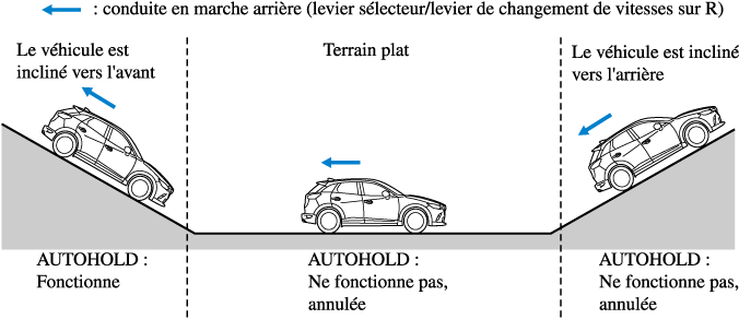La fonction AUTOHOLD est annulée lorsque le levier de changement de vitesse/levier sélecteur est placé en position de marche arrière alors que le véhicule se trouve sur un terrain plat, ou dans une montée ou une descente (comme illustré ci-dessous).