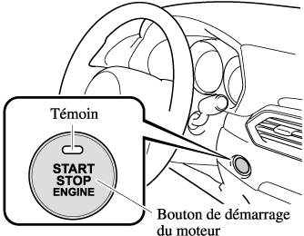 Si le voyant KEY (rouge) s'allume ou si le témoin du bouton de démarrage du moteur (ambre) clignote, cela peut indiquer un problème dans le système de démarrage du moteur lors de l'utilisation habituelle du démarrage (pour les véhicules équipés d'un tableau de bord de type A/type B (Rechercher), les messages s'affichent sur le tableau de bord). Faire inspecter le véhicule par un concessionnaire agréé Mazda dès que possible. Le moteur peut alors être démarré de force. Maintenir le bouton de démarrage du moteur jusqu'au démarrage du moteur. D'autres procédures de démarrage du moteur, telles que la présence de la clé dans la cabine et l'activation de la pédale d'embrayage (boîte de vitesses manuelle) ou de la pédale de frein (boîte de vitesses automatique), doivent être respectées.