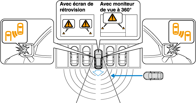 L'indication d'avertissement du système RCTA sur le moniteur de vue à 360° est aussi synchronisée avec le voyant de surveillance des angles morts (BSM) sur les rétroviseurs de portières.