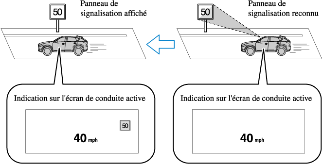 Si la vitesse du véhicule dépasse celle indiquée par le panneau de limitation de vitesse apparaissant sur l'affichage de conduite active en cours de conduite, le système alerte le conducteur par une notification sur l'affichage de conduite active et un signal sonore.