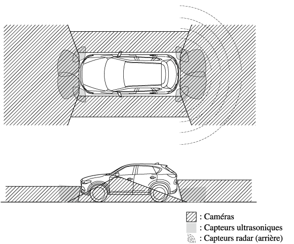Les capteurs de stationnement utilisent des capteurs ultrasoniques pour détecter les obstructions autour du véhicule lorsque ce dernier roule à basse vitesse, par exemple lors du stationnement en garage ou en parallèle, et avertissent le conducteur de la distance approximative entre le véhicule et l'obstruction environnante en émettant un son et en affichant une indication de détection d'obstruction.