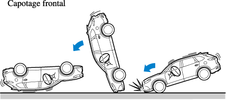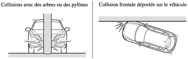 Les illustrations suivantes sont des exemples de collisions frontale/semi-frontale qui sont susceptibles de ne pas être détectées comme assez sévères pour justifier le déploiement de l'équipement de coussin d'air SRS.