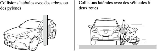 Les illustrations suivantes sont des exemples de collisions latérales qui sont susceptibles de ne pas être détectées comme assez sévères pour justifier le déploiement de l'équipement de coussin d'air SRS.