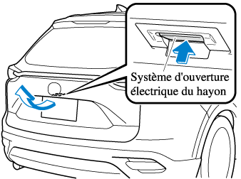 Appuyer sur le système d'ouverture électrique du hayon, puis soulever le hayon. Les feux de détresse vont clignoter deux fois et le hayon s'ouvre automatiquement après le bip sonore.