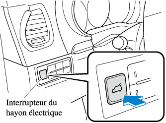 Appuyer sur l'interrupteur du hayon électrique pendant environ une seconde ou plus pendant que le hayon est en position ouverte/fermée complète. Les feux de détresse vont clignoter deux fois et le hayon s'ouvre/se ferme après le bip sonore.
