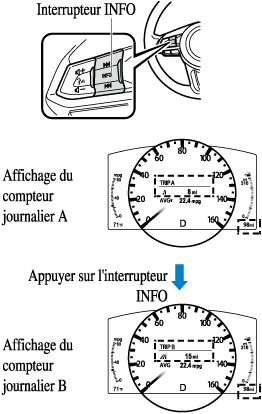 Par exemple, le compteur journalier A peut enregistrer la distance d'un point d'origine, et le compteur journalier B la distance à partir de quand le plein de carburant est fait.