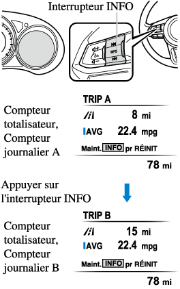 La distance de conduite pour un intervalle spécifié est indiquée. Il est possible de mesurer la distance de deux types d'intervalles (TRIP A, TRIP B) ainsi que l'économie moyenne de carburant pour chacun.