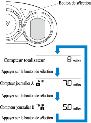 Le mode d'affichage peut être changé entre l'affichage du compteur totalisateur, du compteur journalier A et du compteur journalier B en appuyant sur le sélecteur pendant que l'un d'eux est affiché. Le mode sélectionné sera affiché.