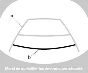Les lignes de guidage sur l'écran sont des lignes fixes. Elles ne sont pas synchronisées avec la rotation du volant par le conducteur. Faire toujours bien attention, et vérifier la zone située à l'arrière du véhicule et la zone environnante directement avec les yeux lorsqu'on recule.