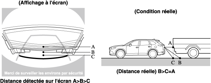 Lorsque l'arrière du véhicule est abaissé, l'objet affiché à l'écran apparaît plus loin qu'il ne l'est en réalité.