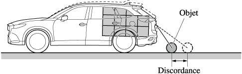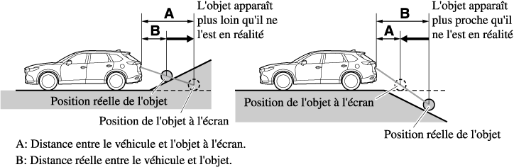 Lorsqu'il y a une pente raide montante (ou descendante) derrière le véhicule, l'objet affiché à l'écran apparaît plus loin (ou plus près en cas de pente descendante) qu'il ne l'est en réalité.