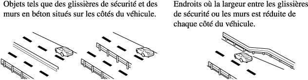 L'indicateur d'avertissement de la BSM peut s'activer et l'écran de détection du véhicule peut être affiché en réponse à des objets stationnaires (garde-corps, les tunnels, les murs latéraux, et les véhicules stationnés) sur la route ou le bas-côté.