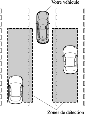 La zone de détection sur ce système couvre les voies de circulation des deux côtés du véhicule et depuis la partie arrière des portières avant à environ 50 m (164 pieds) derrière le véhicule.