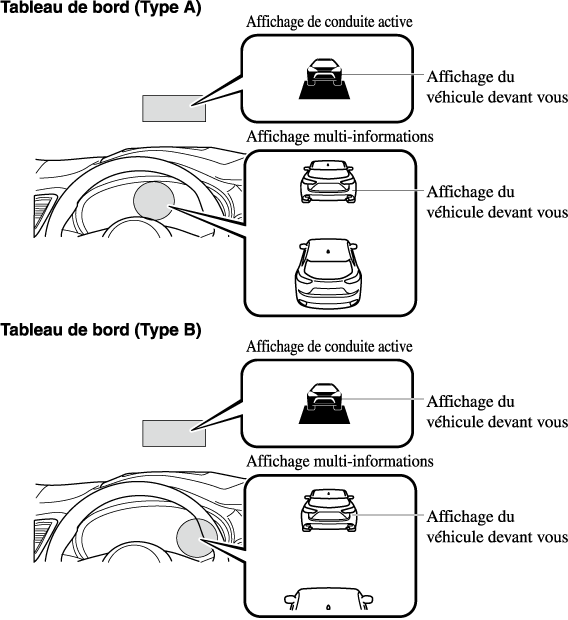 L'état de fonctionnement du DRSS est indiqué sur l'affichage multi-informations ou de conduite active. En ce qui concerne les dysfonctionnements, vérifiez les conditions du véhicule ou faites-le inspecter par un concessionnaire agréé Mazda conformément au contenu du message affiché.
