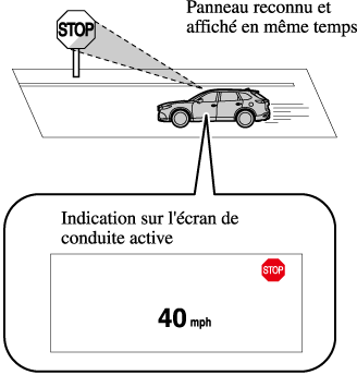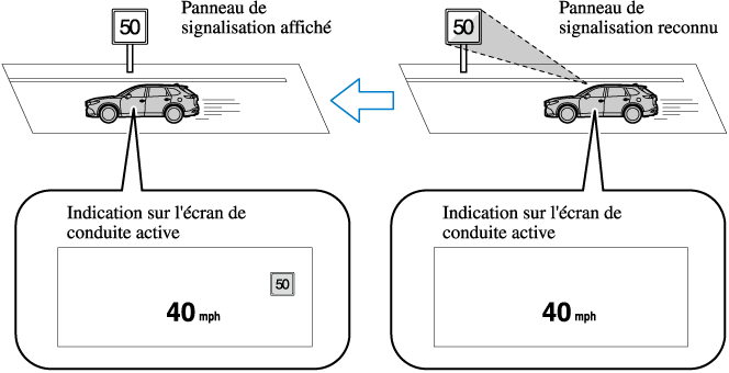 Si la vitesse du véhicule dépasse celle indiquée par le panneau de limitation de vitesse apparaissant sur l'affichage de conduite active en cours de conduite, le système alerte le conducteur par une notification sur l'affichage de conduite active et un signal sonore.