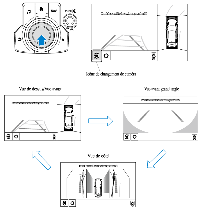 Vous pouvez changer l'écran affiché en appuyant sur le bouton de commande ou en touchant l'icône de changement de caméra sur l'écran lorsque la vue de dessus/vue avant, la vue avant grand angle ou la vue latérale est affichée.