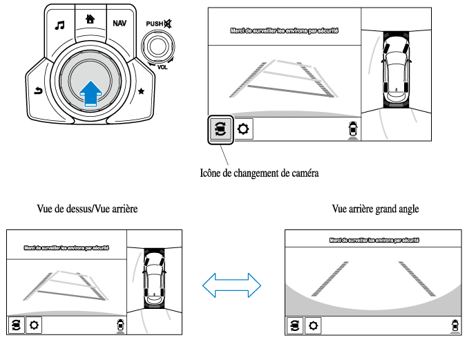 Vous pouvez changer l'écran affiché en appuyant sur le bouton de commande ou en touchant l'icône de changement de caméra sur l'écran lorsque la vue de dessus/vue arrière, vue arrière grand angle est affichée.