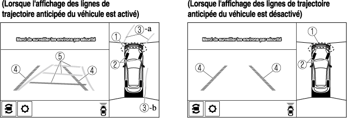 Il est possible de modifier le réglage de manière à masquer les lignes de trajectoire anticipée du véhicule.
