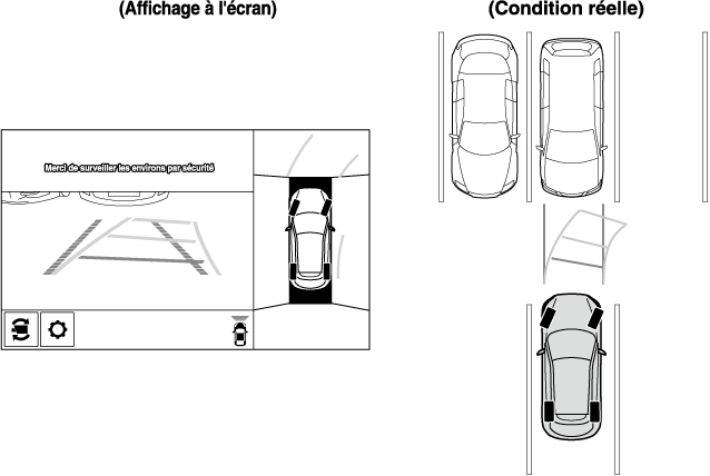 Sur l'écran de vue de dessus, les zones en noir à l'avant et à l'arrière de l'image du véhicule et les zones où les images des caméras se rejoignent sont des angles morts.