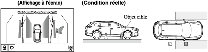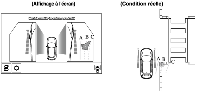 La portée de détection du capteur de stationnement est limitée. Par exemple, les obstructions se rapprochant sur le côté et les objets de faible hauteur peuvent ne pas être détectés. Toujours vérifier visuellement la sécurité du véhicule lors de la conduite.
