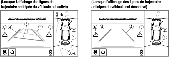 Indique approximativement la trajectoire anticipée du véhicule. Se déplace en même temps que le volant. a) Indique la trajectoire que devraient suivre les roues arrière. b) Indique la trajectoire que devrait suivre le côté extérieur du véhicule. |