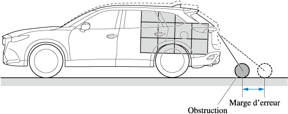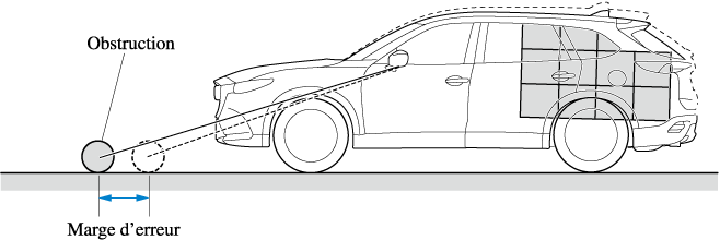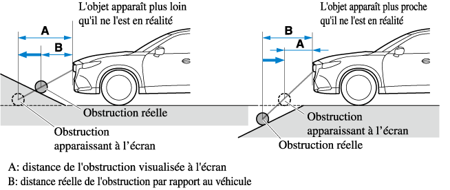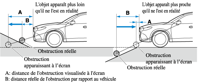 Si la route monte ou descend de manière abrupte à l'avant ou à l'arrière du véhicule, les obstructions détectées par la caméra peuvent sembler plus éloignées ou plus proches qu’elles ne le sont réellement.