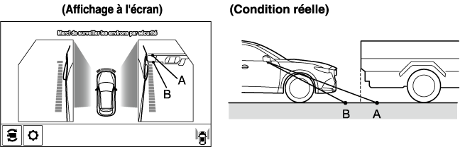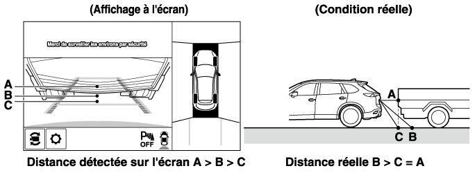 Étant donné que les lignes de guidage d’extrémité avant du véhicule ou les lignes de guidage de distance (caméra arrière) sont affichées sur la base d'une surface plane, la distance à l'objet en trois dimensions affichée sur l'écran est différente de la distance réelle.