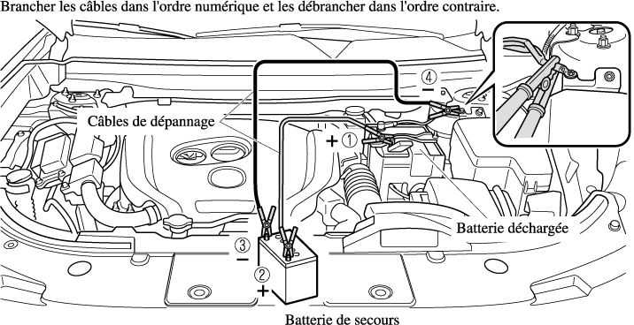 Le démarrage avec une batterie de secours est dangereux s'il n'est pas fait correctement. Suivre prudemment les instructions suivantes. Si l'on est pas certain de comment réaliser un démarrage avec une batterie de secours, s'adresser à un mécanicien compétent.
