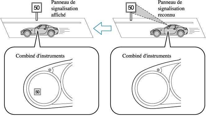 Si la vitesse du véhicule dépasse celle indiquée par le panneau de limitation de vitesse apparaissant sur l'affichage multi-informations en cours de conduite, le système alerte le conducteur par une notification sur l'affichage multi-informations et un signal sonore.