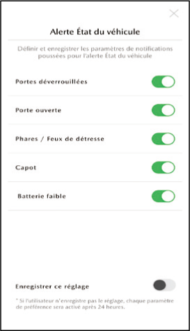 • Vous pouvez définir individuellement si vous souhaitez recevoir des notifications Alerte de l’État du Véhicule.