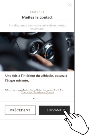 Montez dans votre véhicule et positionnez le contacteur d’allumage/contacteur d'alimentation sur ON, puis appuyez surSUIVANT