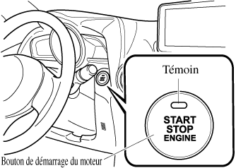 Si le voyant KEY (rouge) s'allume ou que le témoin du bouton de démarrage du moteur (ambre) clignote, il est possible que le moteur ne puisse démarrer en utilisant la méthode de démarrage usuelle. Faire inspecter le véhicule par un concessionnaire agréé Mazda dès que possible. Le moteur peut alors être démarré de force. Maintenir enfoncé le bouton de démarrage du moteur jusqu'au démarrage du moteur. D'autres procédures de démarrage du moteur, telles que la présence de la clé dans la cabine et l'activation de la pédale d'embrayage (boîte de vitesses manuelle) ou de la pédale de frein (boîte de vitesses automatique), doivent être respectées.