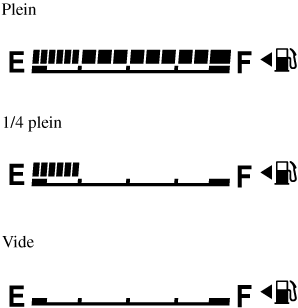 Après qu'on ait refait le plein de carburant, un certain temps pourra être nécessaire avant que l'indicateur se stabilise. En outre, il est possible que l'indicateur dévie lors de la conduite sur une pente ou dans un virage, en raison des mouvements du carburant à l'intérieur du réservoir.