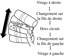 Déplacer le levier vers le haut (pour un virage vers la droite) ou vers le bas (pour un virage vers la gauche) à partir de la position d'arrêt. Le clignotant s'annule automatiquement après la sortie du virage.